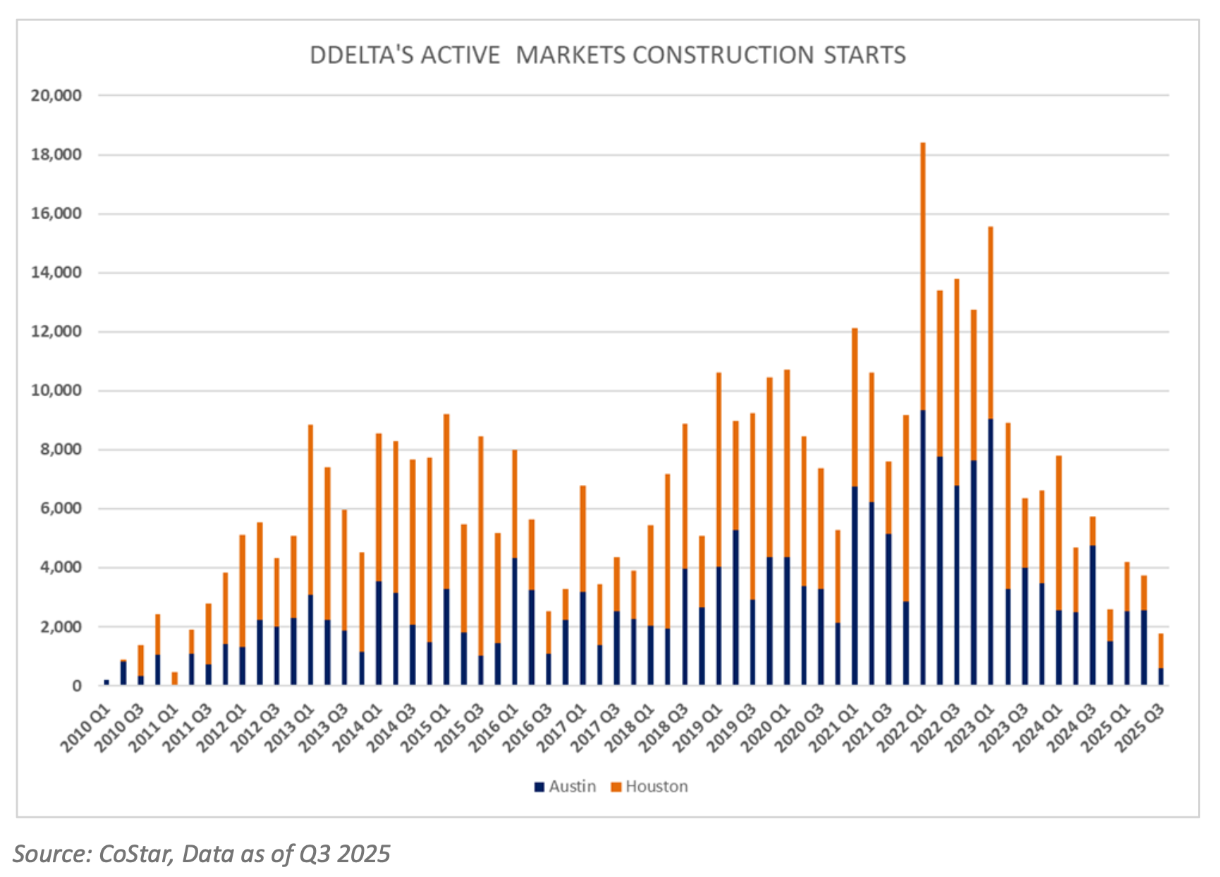 These trends vary by region, with certain MSAs in the Sun Belt experiencing clearer signs of improved fundamentals. In the major Texas markets, for example, a 35% reduction in deliveries during the first 9 months of 2025 has been experienced as compared to the same period in 2024. Demand, on the other hand, has exceeded pre-pandemic averages by over 72%, allowing vacancies to compress as excess supply starts getting absorbed.